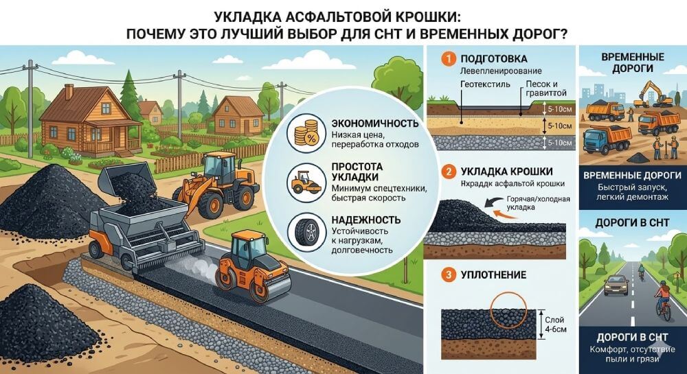 Укладка асфальтовой крошки: почему это лучший выбор для СНТ и временных дорог?